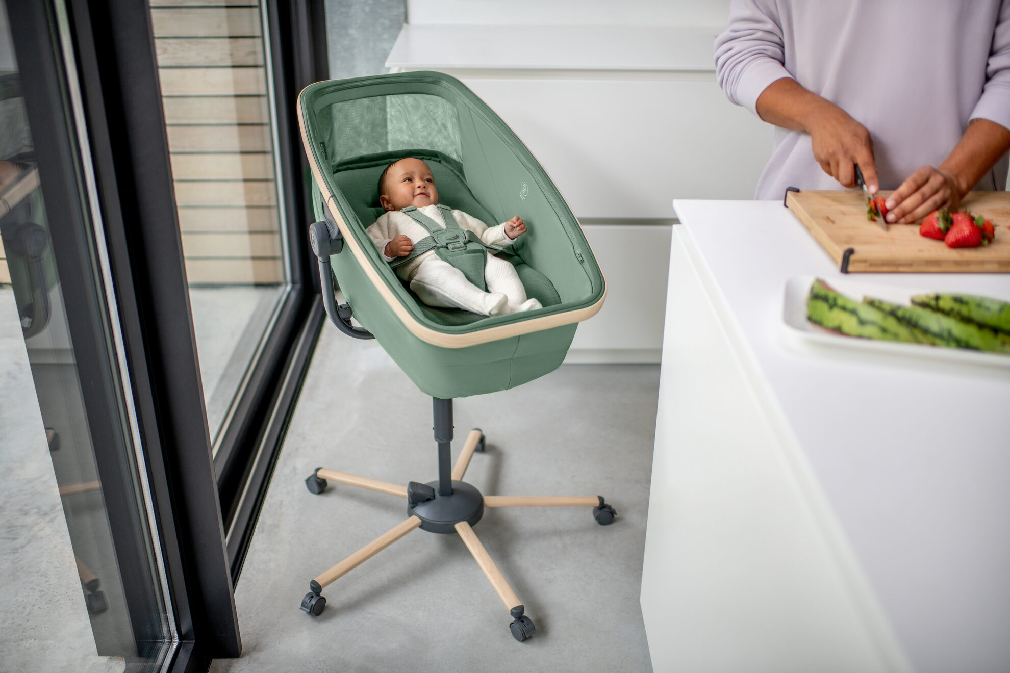 Mantener a su bebé junto a usted durante todo el día hace que sea mucho más fácil moverse juntos por la casa. Su bebé puede jugar, comer y dormir la siesta en todas partes con comodidad, mientras usted hace sus tareas. Nuestro Maxi-Cosi Alba es un elegante moisés, sillón reclinable y trona todo en uno, diseñado con ruedas para ayudar a su bebé a acercarse. Se puede utilizar desde el nacimiento hasta los 3 años. Alba está confeccionado con tejidos supersuaves 100 % reciclados y cuenta con un colchón extragrueso para garantizar el máximo confort a tu bebé.