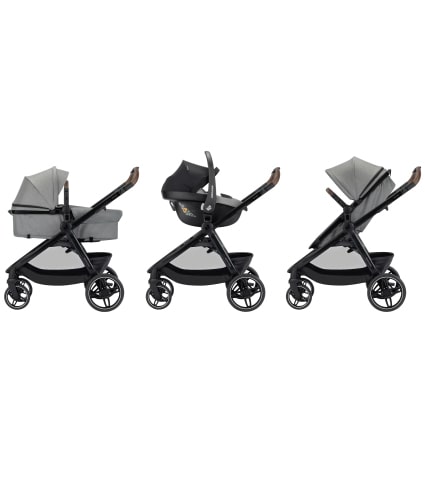 El Zelia Select todo en uno incluye el cochecito con un capazo convertible en asiento 2 en 1, la silla de coche CabrioFix S i-Size y el bolso del bebé a juego: el sistema de viaje más práctico desde el primer día hasta los 4 años.