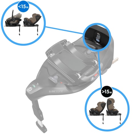 Fácil de subir y bajar gracias a SLIDETECH®2 | Una base, varias sillas de coche | Viajes seguros desde el nacimiento hasta los 4 años | Indicadores de instalación codificados por colores | Bloqueo de giro para viajes a contramarcha seguros |